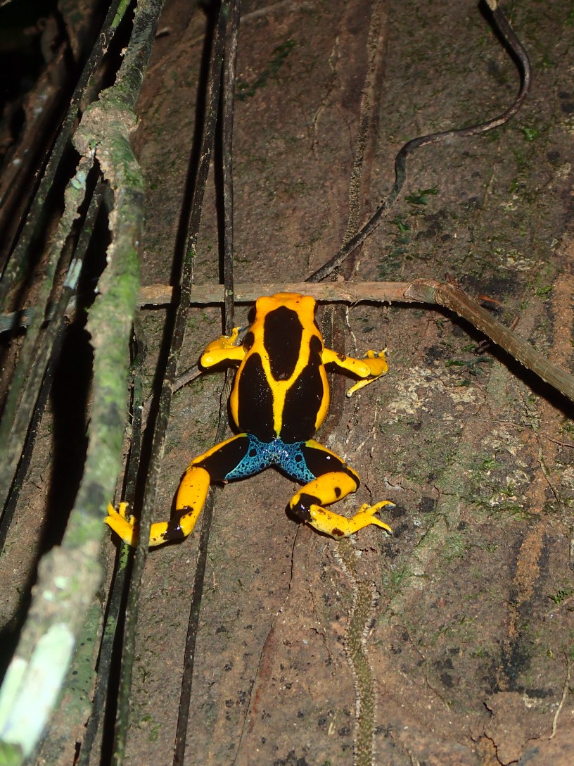 Arrivée au début de la voie ferrée, nous goûtons quelques délicieuses mangues sabots tombées à pic! Nous commençons donc la randonnée en suivant la voie ferrée jusqu’au rafting, puis longeons les carbets abandonnés et arrivons aux premières vues de ce splendide saut! Suite à une brève pause, nous nous dirigeons vers le sentier, dont nous parcourons la première partie au bord du fleuve avant de déjeuner sous l’abri situé entre les deux boucles. Nous entamons la seconde partie, avec des sacs légèrement moins lourds, direction le carbet où nous comptons dormir, par le côté intérieur de la boucle. Sur la route, nous croisons le chemin de quelques dendrobates colorées à souhait, quelques araignées au fond de leur trou, des fleurs variées et de magnifiques ficus étrangleurs. Une fois arrivée au carbet, voilà qu’il est déjà occupé par quatre brésiliens, nous décidons donc d’installer cinq d’entre nous sur place et les cinq autres au carbet plus loin, situé au bord d’une petite plage. L’abri de la plage n’étant pas de grande taille, deux des marcheurs feront un carbet bâche au bord de la plage. Après installations des hamacs, nous nous regroupons tous à la plage pour une baignade bien méritée pour tous puis un copieux repas collectif au coin du feu dans le premier carbet. La nuit sera un peu bruyante de part et d’autres. Le second jour débute par un petit déjeuner sur la plage, après le regroupement des deux groupes, ainsi que quelques baignades matinales pour certains. Retour tranquille au point de départ en longeant le fleuve cette fois ci, ponctué par le sauvetage d’une tortue par certains, l’envol devant des chanceux d’une harpie féroce et quelques beaux spécimens d’iules. Pour clore cette matinée de marche, nous nous dirigeons vers le rafting pour profiter de bonnes boissons fraîches, ainsi que d’un accueil chaleureux par la petite famille fort sympathique tenant l’entreprise (de nouvelles idées de sorties avec eux émergent dans les pensées de certains, à prévoir pour des prochaines fois). Nous finissons ce week-end par un pique nique, quelques siestes à l’ombre et les dernières baignades au saut, avant de retrouver le piroguier au bout de la voie ferrée. Celui-ci nous approche au plus près du saut pour pouvoir apprécier la force des eaux : c’est impressionnant ! Retour en fin d’après midi à Cayenne ou escapade brésilienne pour certaines!