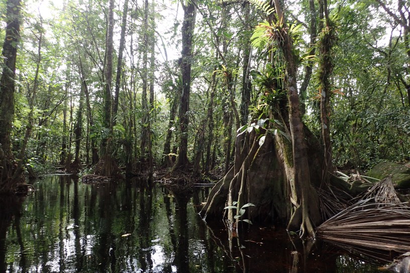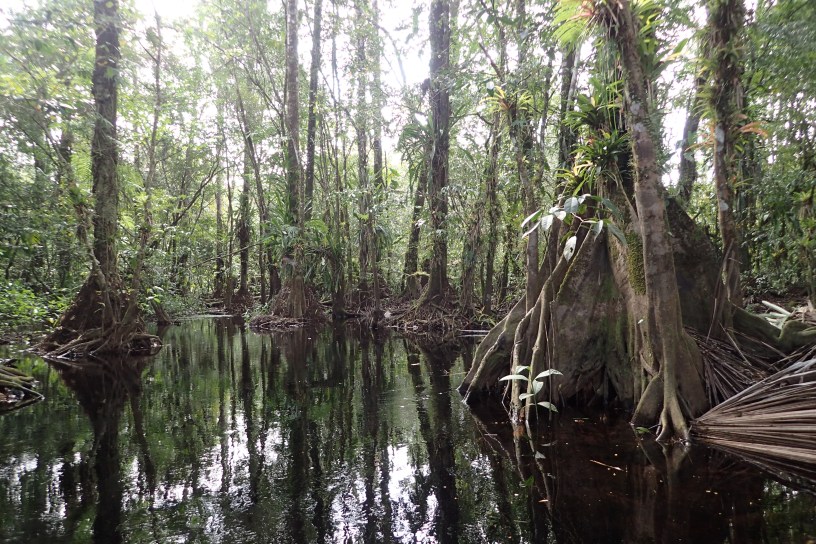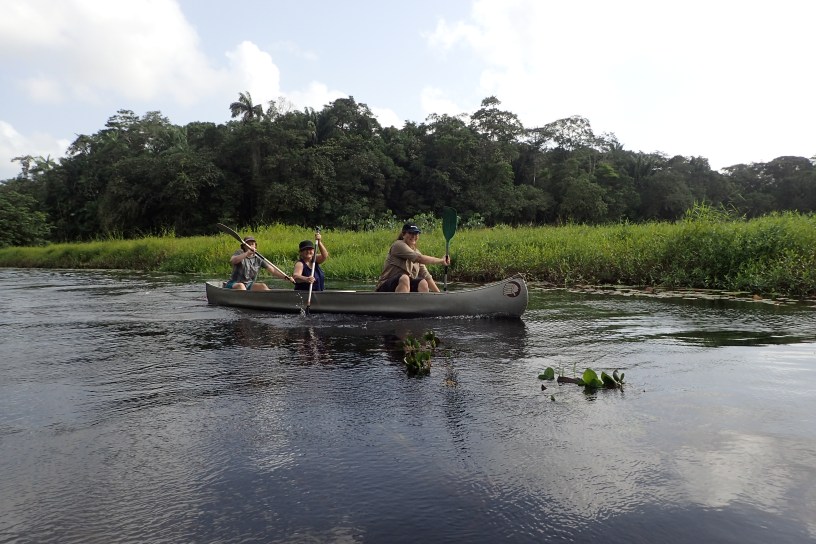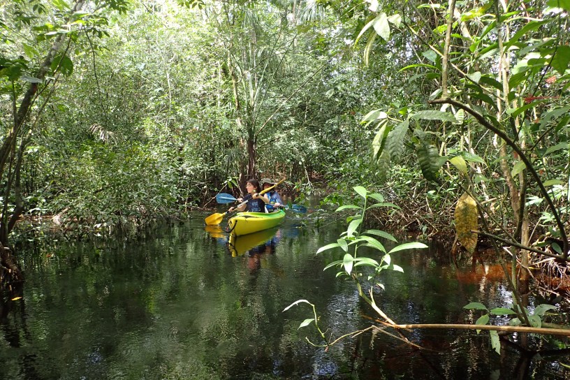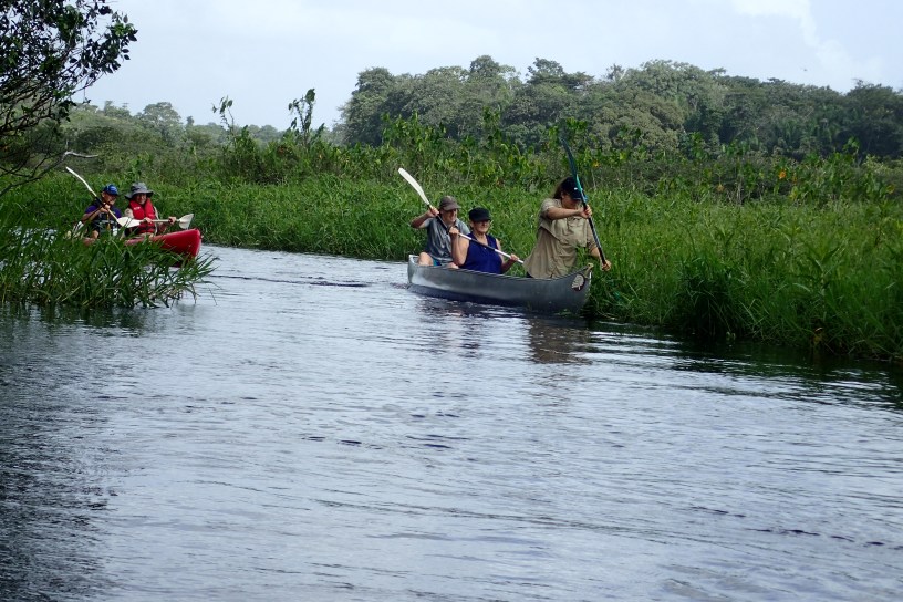 Apres bien des surprises de manque d’eau au niveau des criques d’arbres tombes nombreux empêchant la progression, d’horaires de marée défavorable , Nicolas et moi avons décidé de changer d’itinéraire et de faire crique Gabrielle Lac Pali au lieu de la montagne serpent .C est à neuf personnes que nous avons fait cette rando et à 4 canoës .Nous avons mis à l’eau au Dégrad Escolle en haut de la Gabrielle .C est dans la bonne humeur et après un petit café accompagné d’un cake au citron que nous avons attaqué la rivière .Un petit passage difficile dû au courant à permit au 3 filles du canoë alu de bien se rôdé pour la suite du périple .Un vrai slalom géant bien amusant pour tous .Devenue presque des pros en peu de temps car tenue d’une main de maitre par la barreuse la difficulté fut surmontée .Arrivée dans la savane la promenade commença vraiment .Jacana , et autres oiseaux nous accueillent avec chants et vols dans leur paradis .La douceur du temps et la tranquillité de cet endroit nous fit aussitôt oublier les soucis de la semaine .Remontée tranquille jusqu’à la bifurcation du lac Pali ou là nous attendait un bon courant contraire dans un goulet étroit de la savane , pas facile .Les nombreux virages et troncs en travers ajoute de la difficulté à notre passage .Parfois obligé de descendre dans l’eau pour progresser des moments vraiment sympas .Apres quelques égarements nous voici avec nos 4 canoës dans le lac Pali au milieu des arbres, des savanes inondées , des nénuphars et jacinthes d’eau .3 grands Ara jaune et bleu nous survolant plusieurs fois avec leurs cris stridents à faible hauteur , spectacle magnifique .Nous avons pique-niqué sur une bande de terre dégagée sous les arbres au bord de l’eau .Endroit super ou nous avons d’ailleurs un peu traîné l’ambiance étant très bonne entre tous .Le retour par le même chemin mais cette fois ci avec le courant favorable fut très agréable et plus aisé malgré tout .Une sortie annulée rattrapée par une autre , l’effort en valait la peine car chacun semblait satisfait de sa journée .Merci à tous .
