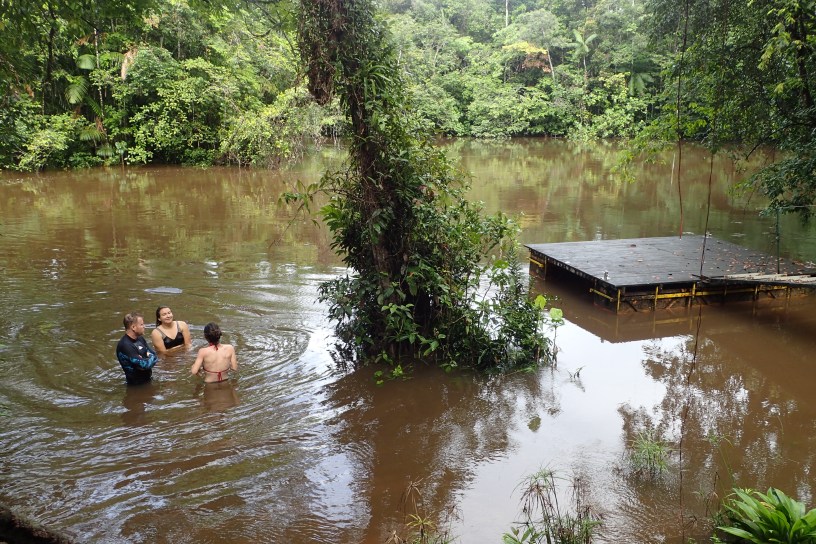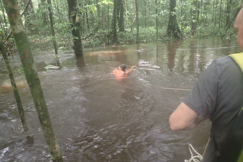 Le lendemain, inversion des groupes. Les randonneurs partent vers 7h45. La marche se passe sans problème, le niveau des eaux à bien baissé et les criques sont passées sans problèmes.Les rameurs quand à eux prennent le temps d’une baignade et rentrent tranquillement plus ou moins portés par le courant… Tout le monde se retrouve vers 15h sur le parking et prend le chemin de retour vers Cayenne.