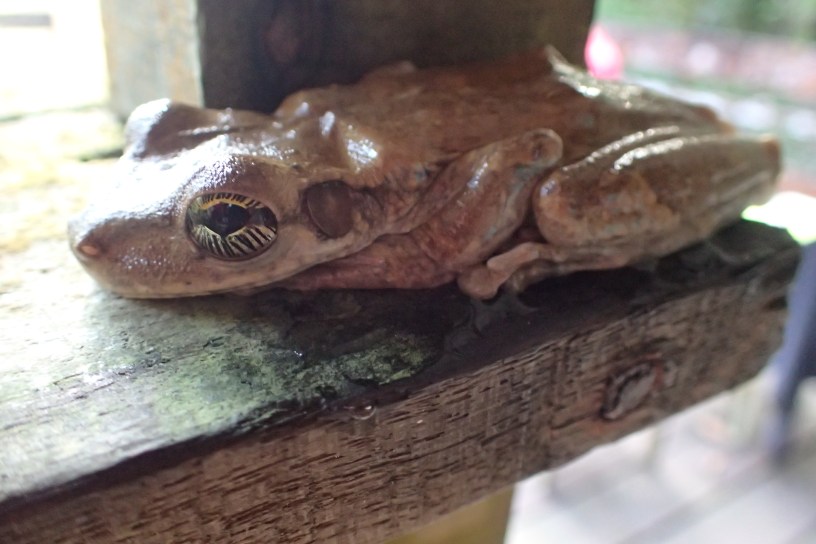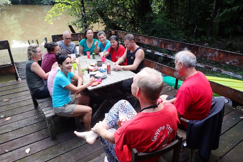 Pendant ce temps les « rameurs » après 4 heures d’effort arrivent au carbet Mino. Vers les 16 heures les deux groupes se rejoignent. Après l’installation des hamacs et une bonne baignade dans la crique Couy, nous attaquons un petit apéritif et un bon repas. L’ambiance de la soirée est assurée par les histoires et les bonnes blagues de Gérard !!!!
