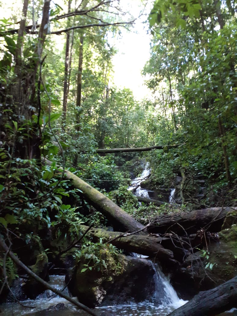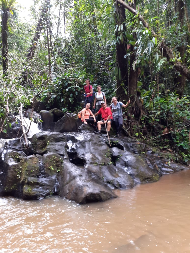 Départ de la randonnée aquatique des cascades , nous arrivons au pied de la cascade avec son jacuzzi naturel et très remuant que nous contournons pour l instant par la gauche et en suivant Sarah et son GPS nous montons en suivant un layon étroit qui nous mèneras bien en amont de la chute et nous retrouvons la crique après une descente aux marches dignes de celles des Remparts de l île de la Réunion