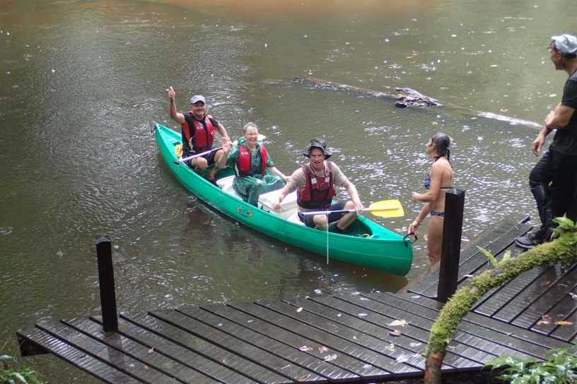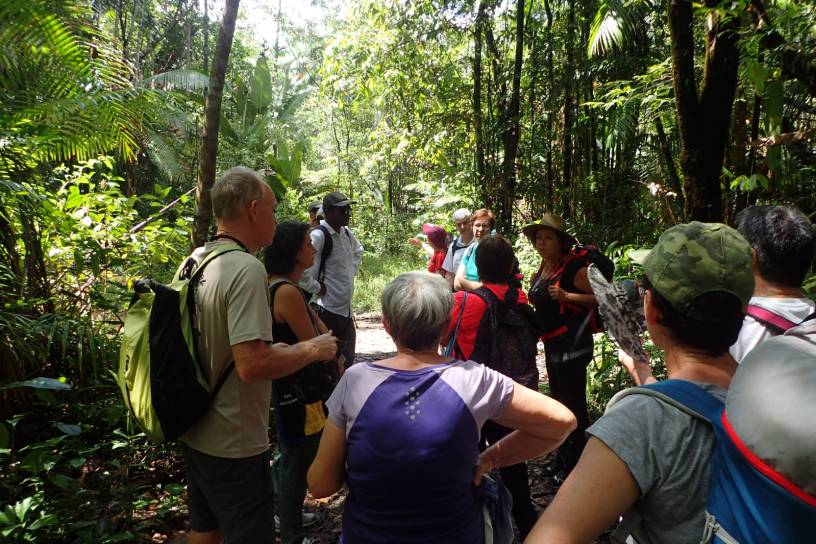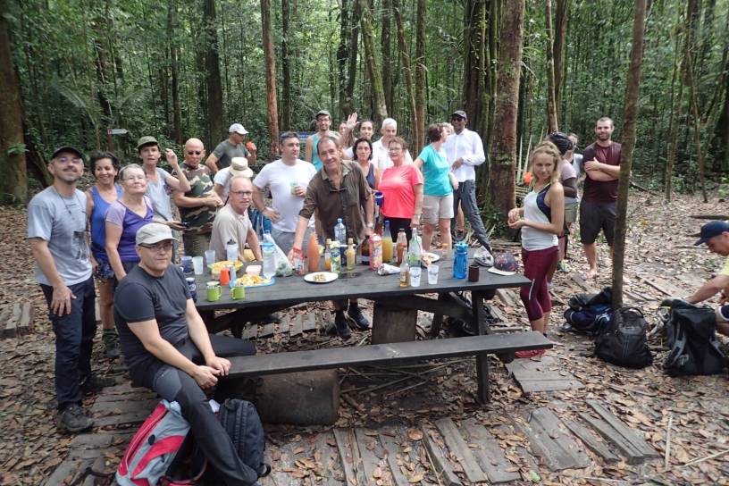 Départ à 10H00 du parking , sous un soleil radieux, pour la visite du bagne des Annamites et ses alentours. A 12h00 les 34 participants se retrouvent au bord de la Tonnegrande sur l’aire de pique nique pour un apéritif très varié!!! Le tonnerre gronde et la pluie guyanaise ne tarde pas à faire son apparition et arrose copieusement le repas. Puis c’est l’heure du retour qui se fait sous un deuxième orage. Bravo à la doyenne Françoise (80 ans) qui a bravé les éléments jusqu’au bout!!!