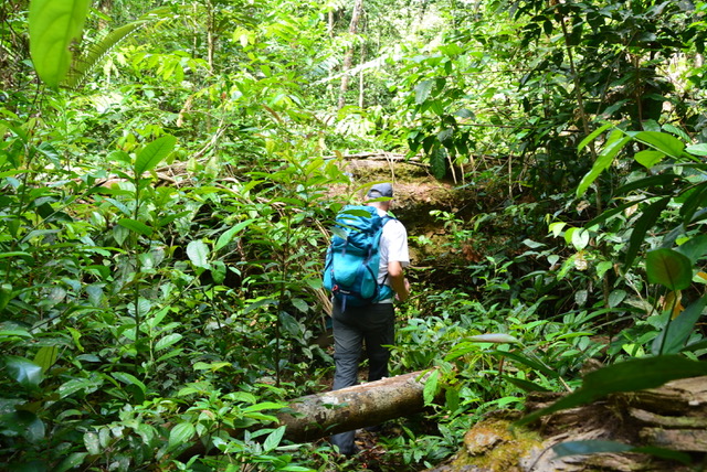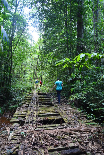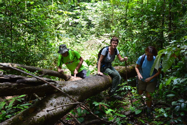La randonnée se poursuit sur le layon, nous marchons d’un bon pas accompagnés par le chant d’aras et de papayos .