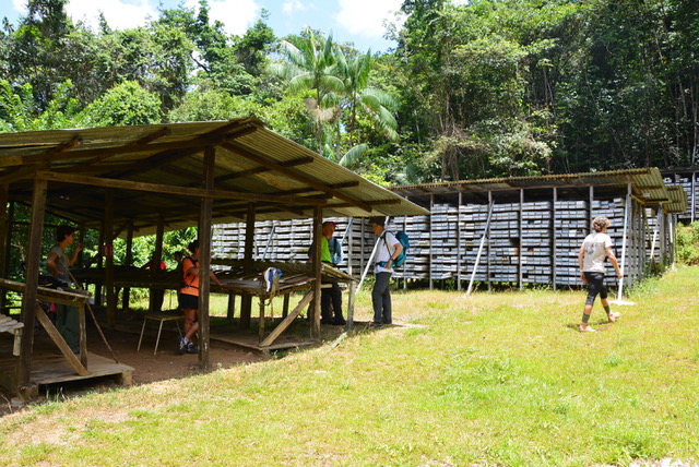 Vers les 12H00 nous arrivons sur le site minier où les hangars abritant les carottages sont toujours debout et témoignent de l’activité passée. Après une baignade rafraîchissante dans la crique et un bon casse-croûte nous reprenons le chemin. Le retour est éprouvant car la piste monte et la chaleur est très lourde. Apres 6H00 d’effort nous sommes de retour à l’Amazonia Lodge où une douche et des rafraîchissements nous « requinquent » avant de reprendre la route sur Cayenne.