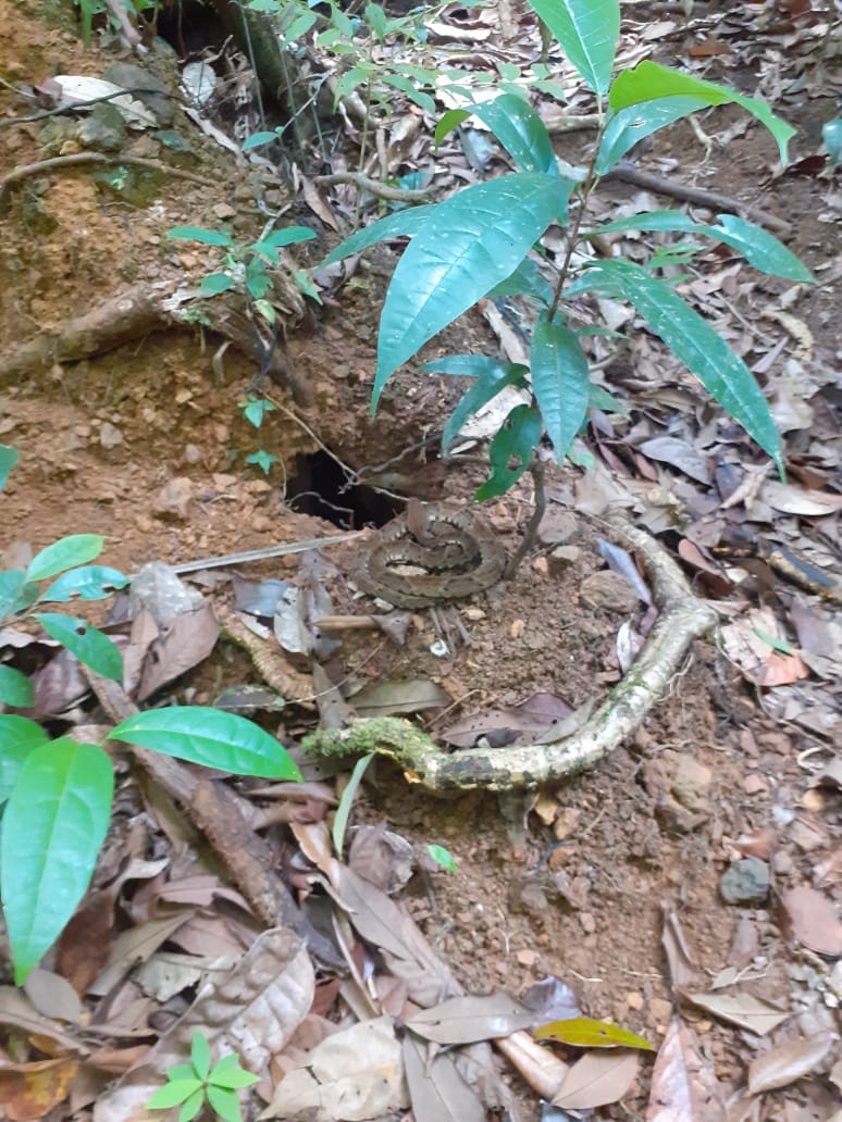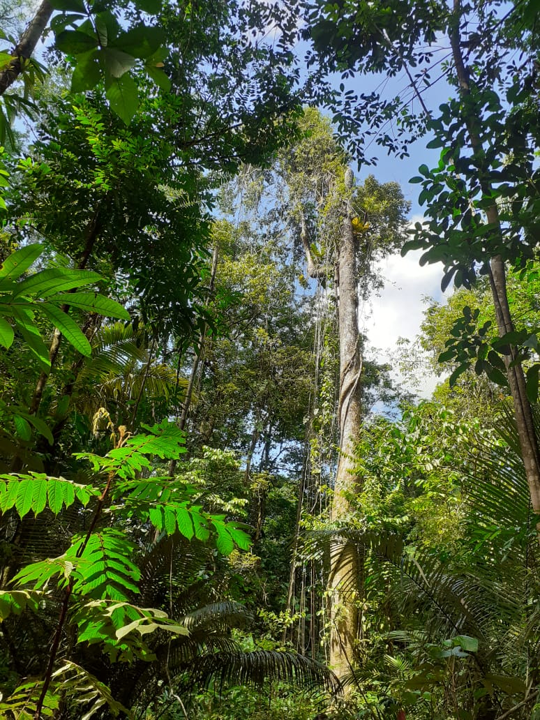 A un moment nous nous rapprochons de la route de Kaw;on peut entendre les véhicules puis l’on redescend vers plusieurs criques mais sèches.Ensuite à l embranchement avec le chemin qui mène à Favard;nous tournons à droite.Il y a de très beaux arbres majestueux et droits,soit couverts de racines d’épiphyte soit enlacés par de nombreuses lianes ,qui cherchent la lumière.Les bois cathédrales sont imposants et si hauts!!