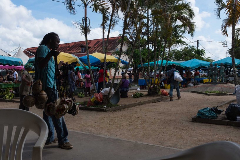 Après une courte nuit, nous partîmes à l’aube en direction de la fabrique de Couac Cetout, sur la piste des chutes voltaire (notons qu’il faut faire un peu de piste pour accéder au site). Une fois arrivée, nous rencontrâmes le propriétaire qui nous avait « oublié », par un quiproquo très obscur et assez discutable, il n’avait pas vérifié le versement de l’argent auprès de son comptable. Nous nous retrouvâmes SPF (Sans programme fixe) dans une situation qu’aucun des mots ne pouvaient changer. Nous convînmes d’un remboursement intégral et il nous offrit des boissons qu’il faisait : jus de cannes, de coco ou de wassai. Rentrant tous dans nos berlines, nous repartîmes aussi vite que nous étions venus en direction du marché de Saint Laurent afin que certains visitent le camp de la transportation, d’autres une promenade le long du Maroni. Nous mangeâmes au marché des produits locaux et repartîmes en direction de la forêt des Malgaches. La plupart des personnes n’étaient pas très motivé et avait envie de se baigner, nous décidâmes de faire le circuit de l’étang et non celui des arbres sculptés. La fatigue pour certain, l’envie de se baigner pour d’autres nous acheva et un seul objectif se fixa dans nos têtes, rentrer au carbet. Arrivé au lieu de détente, la plupart se baignèrent dans la crique rouge (assez propre), d’autres lire, dormir, etc. Les malheurs passèrent, nous partageâmes un bon repas commun avec de l’alcool et des vivres à foison. L’humeur était au beau fixe, les malheurs étaient oubliés, de son côté François avait été rapatrié avec sa voiture sur Cayenne, déçu et puni, il travailla donc son dimanche pour oublier et ronger ses freins.
