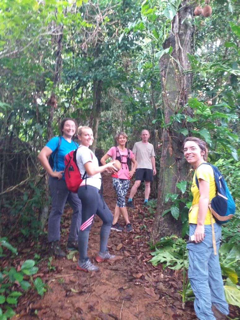 La randonnée se déroule très bien avec de jolies points de vue et du grignotage de mangues et de cerises pays sur le layon. Une fois arrivée à une bifurcation sur le Rorota, le groupe se divise suite à la volonté de certains de faire une petite boucle tout en nous rejoignant peu de temps après. Mais les layons ne se croisèrent pas et nous dûmes continuer sans eux, eux ayant continué sans nous. Nous continuâmes donc pour rattraper le sentier du Rorota puis celui du fort diamant. Là nous bifurcâmes à droite pour partir vers le domaine Pascaud où les deux explorateurs furent retrouvés. Ils avaient emprunté un sentier plus rapide ne passant pas par le sentier du Rorota (piste à explorer).