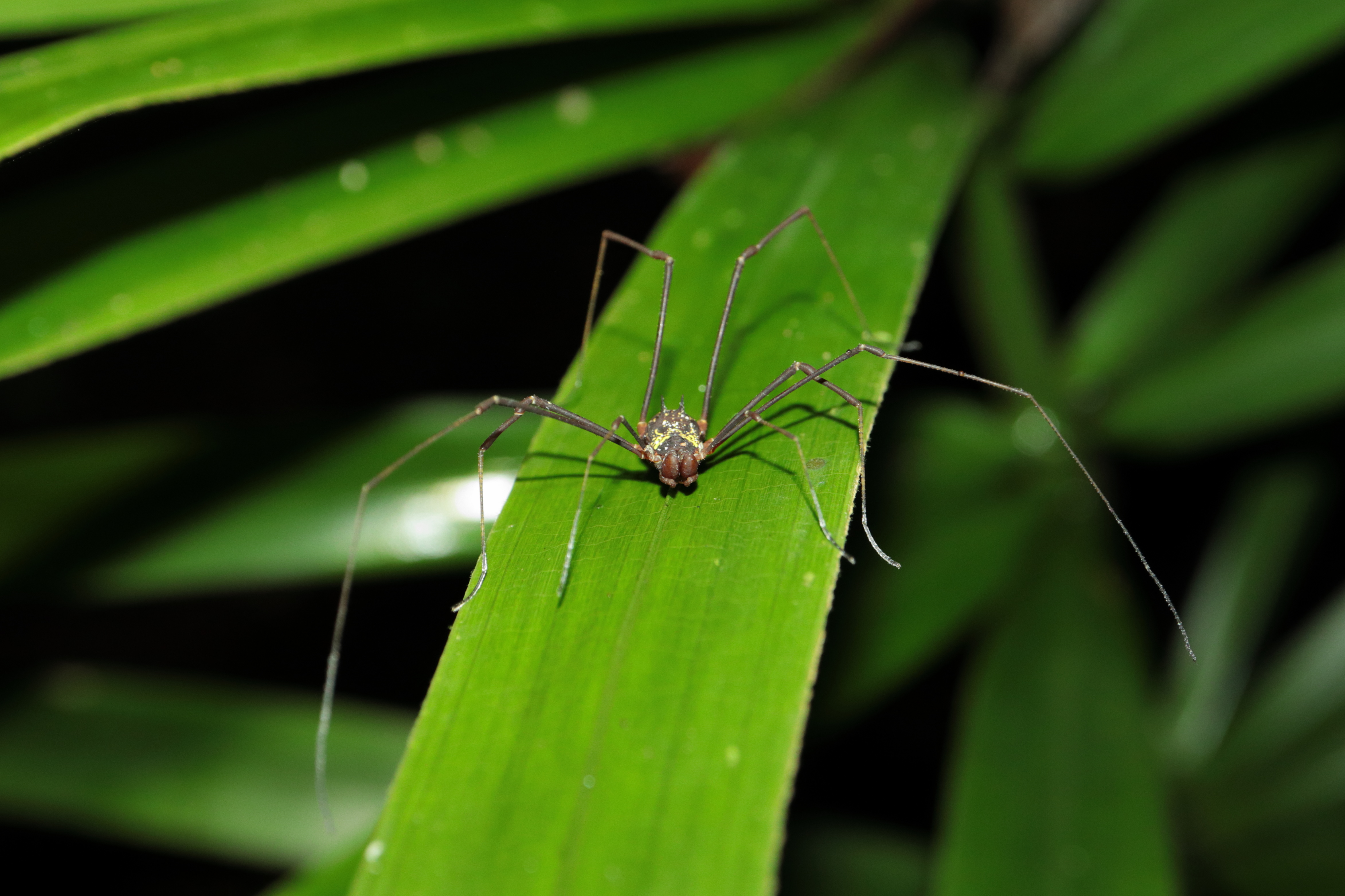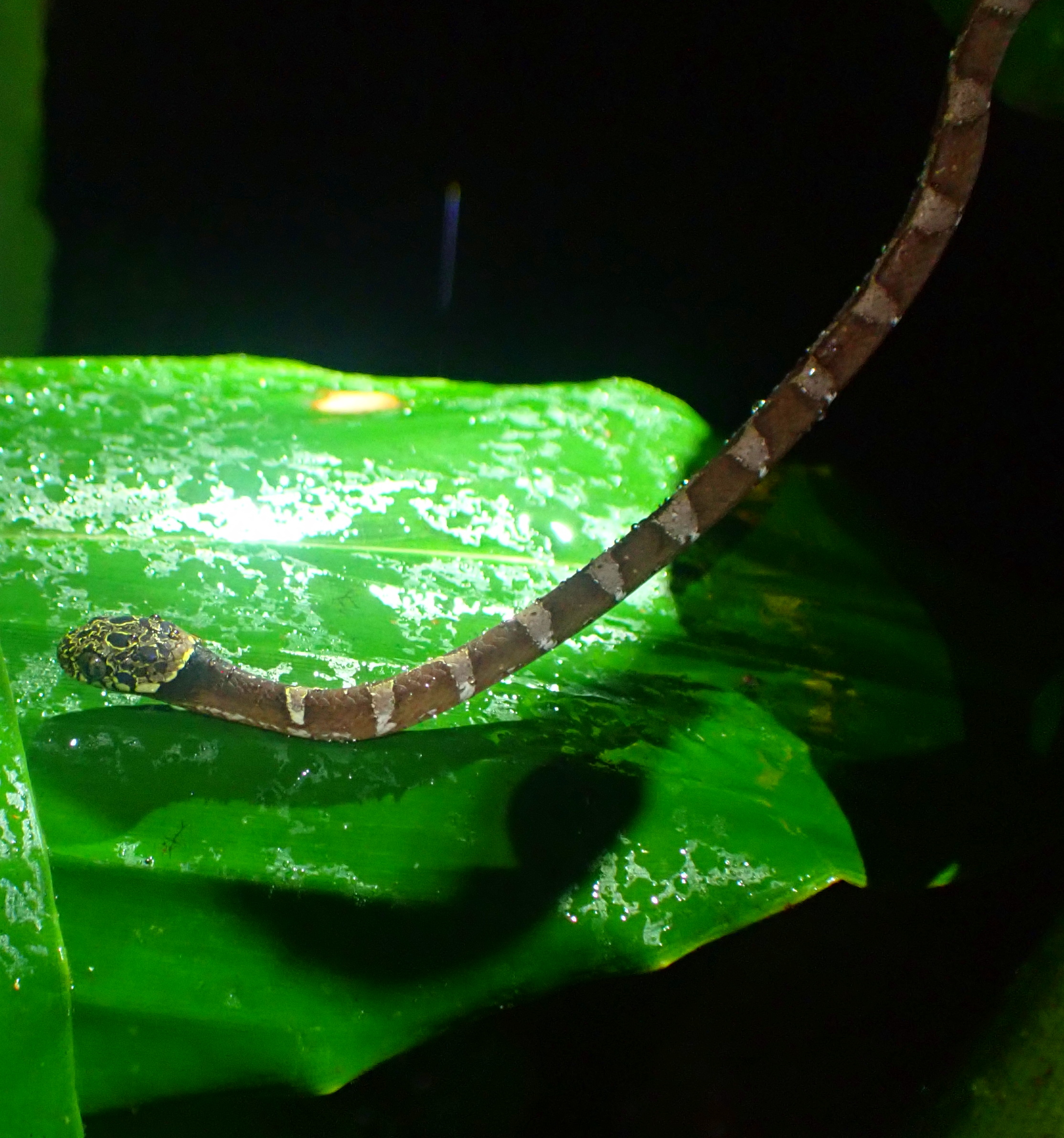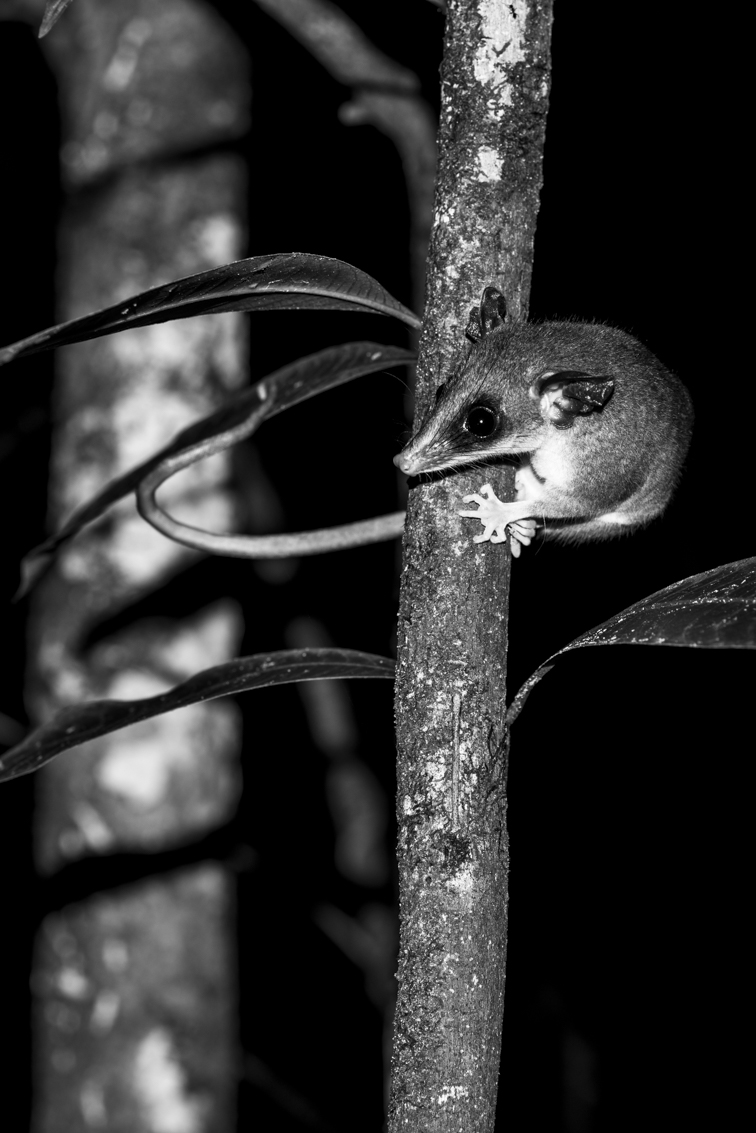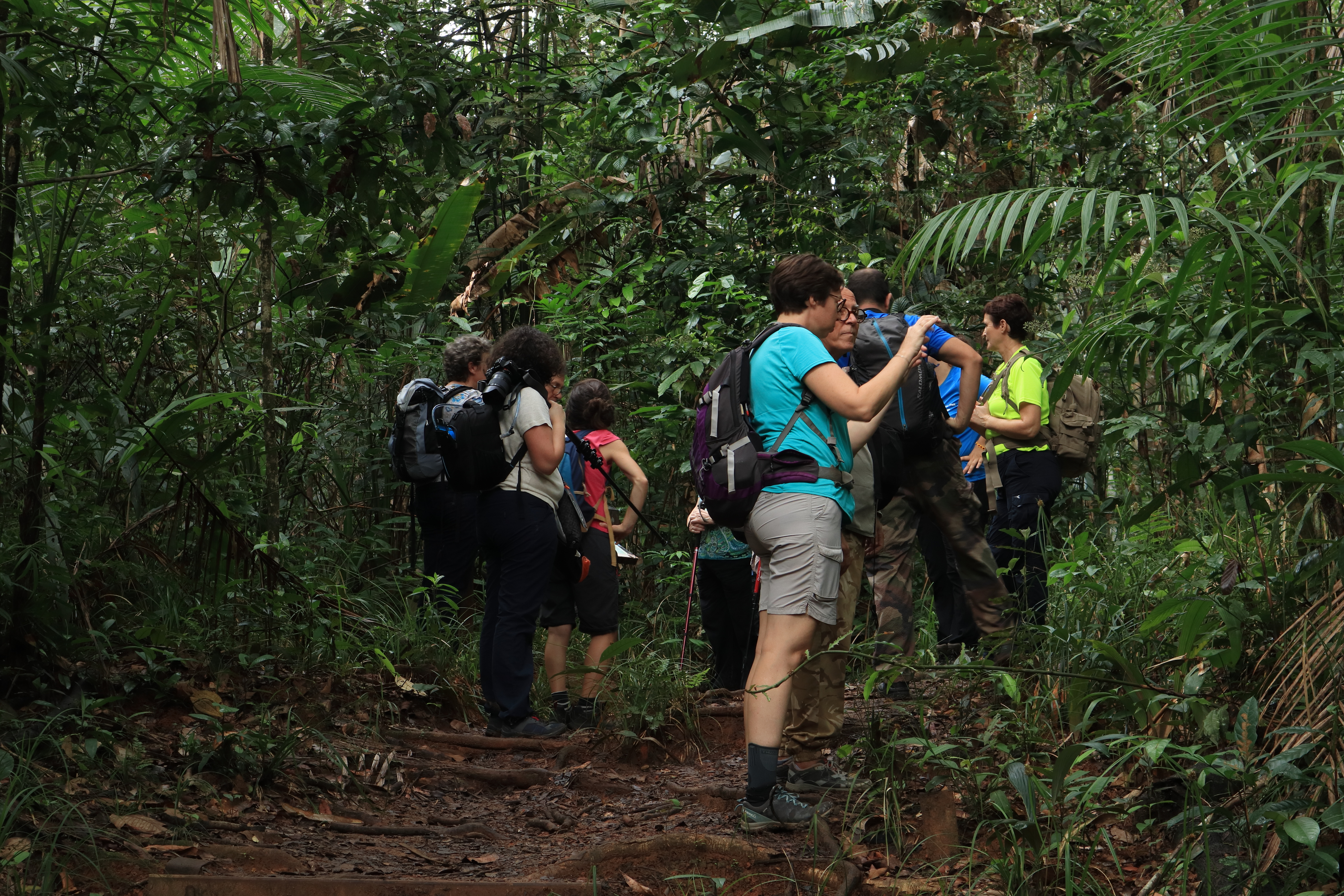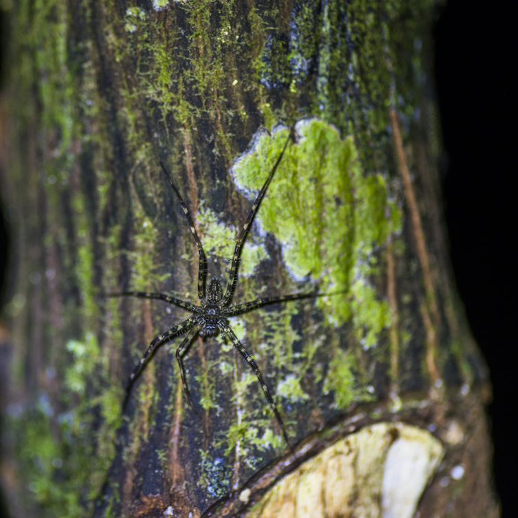 A la tombé de la nuit, nous avons allumé nos lampes pour rentrer lentement afin d’observer la faune nocturne guyanaise : grenouilles, araignées, mygales, amblypyges, phasmes, souris opossum, et même tatou et serpent pour les plus chanceux.
