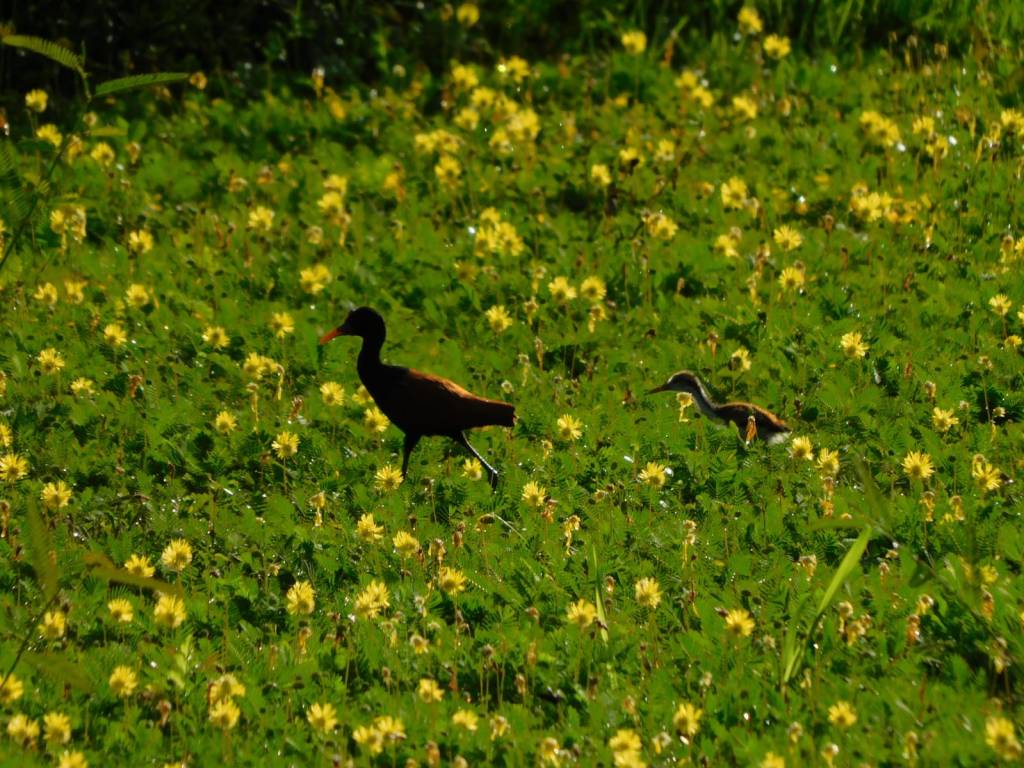 On avance vers les champs de buffles, zones beaucoup plus ouvertes. Sur les poteaux de bois et les barbelés le on peut approcher de près des sturnelles militaires et on s émerveille devant des orioles jaunes. Et dans les champs on observe pêle-mêle des touis étés, grandes aigrettes, des aigrettes bleues, des jacanas avec leurs petits, des moucherolles pies et moucherolles à tête blanches, des anis. On a même la chance de voir un vol d aras macavouannes!