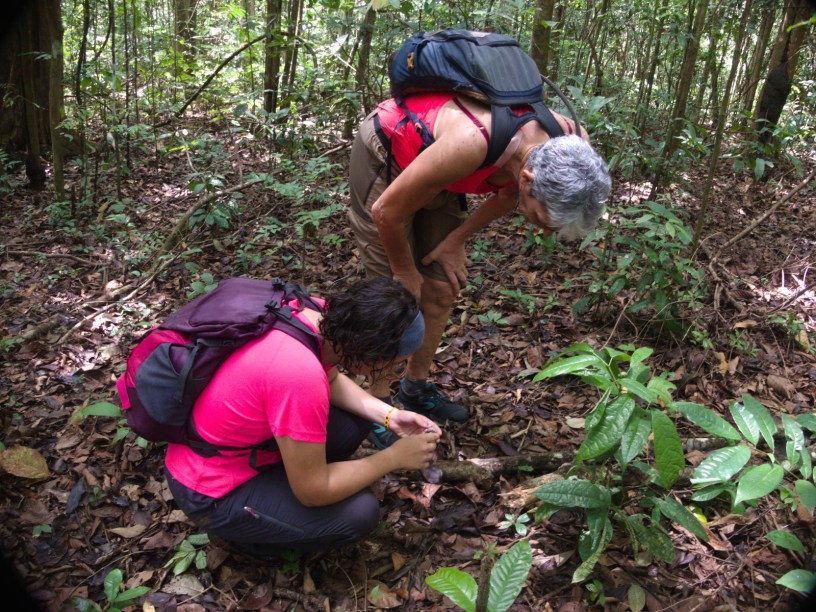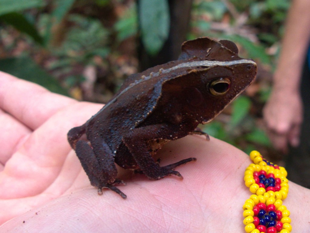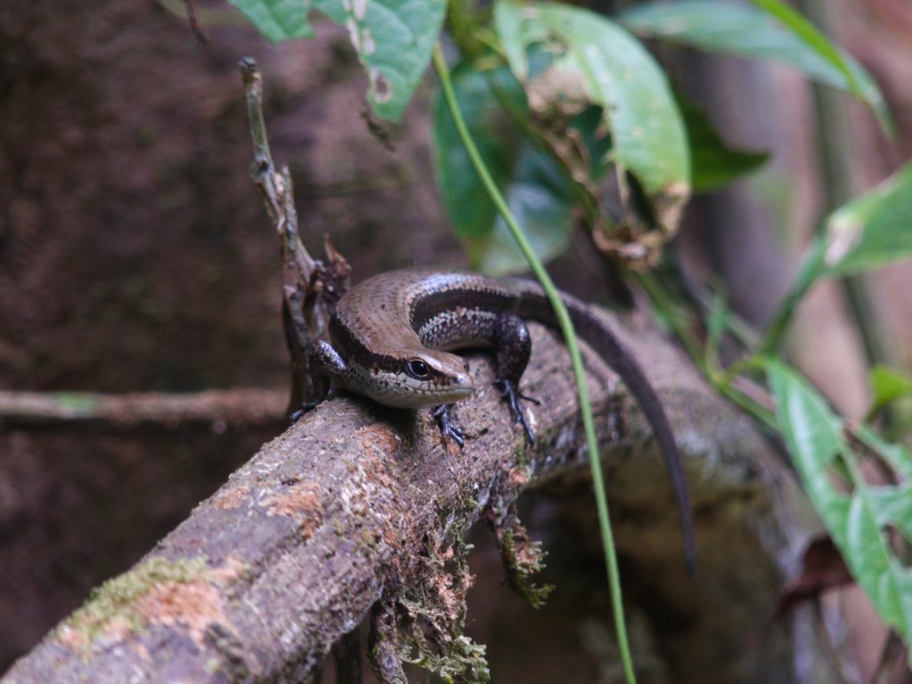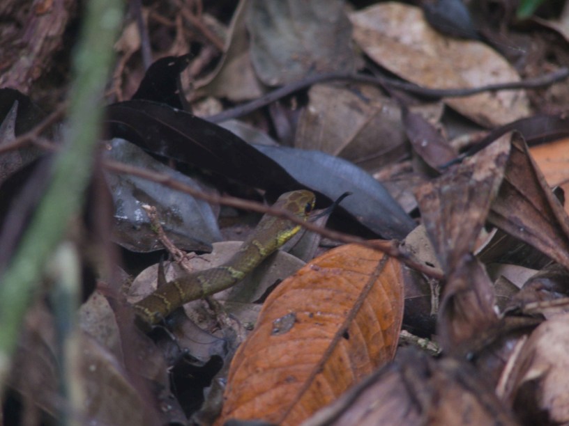 Dans l’après-midi, nous avons eu la chance de croisée un petit serpent gris barré de blanc, peut-être un juvénile de Couresse (Drymoluber) ou de Dipsas, mais aussi quelques Rhinella Margaritifera (crapaud feuille), des nombreuses atelopus flavescens et des anolis.