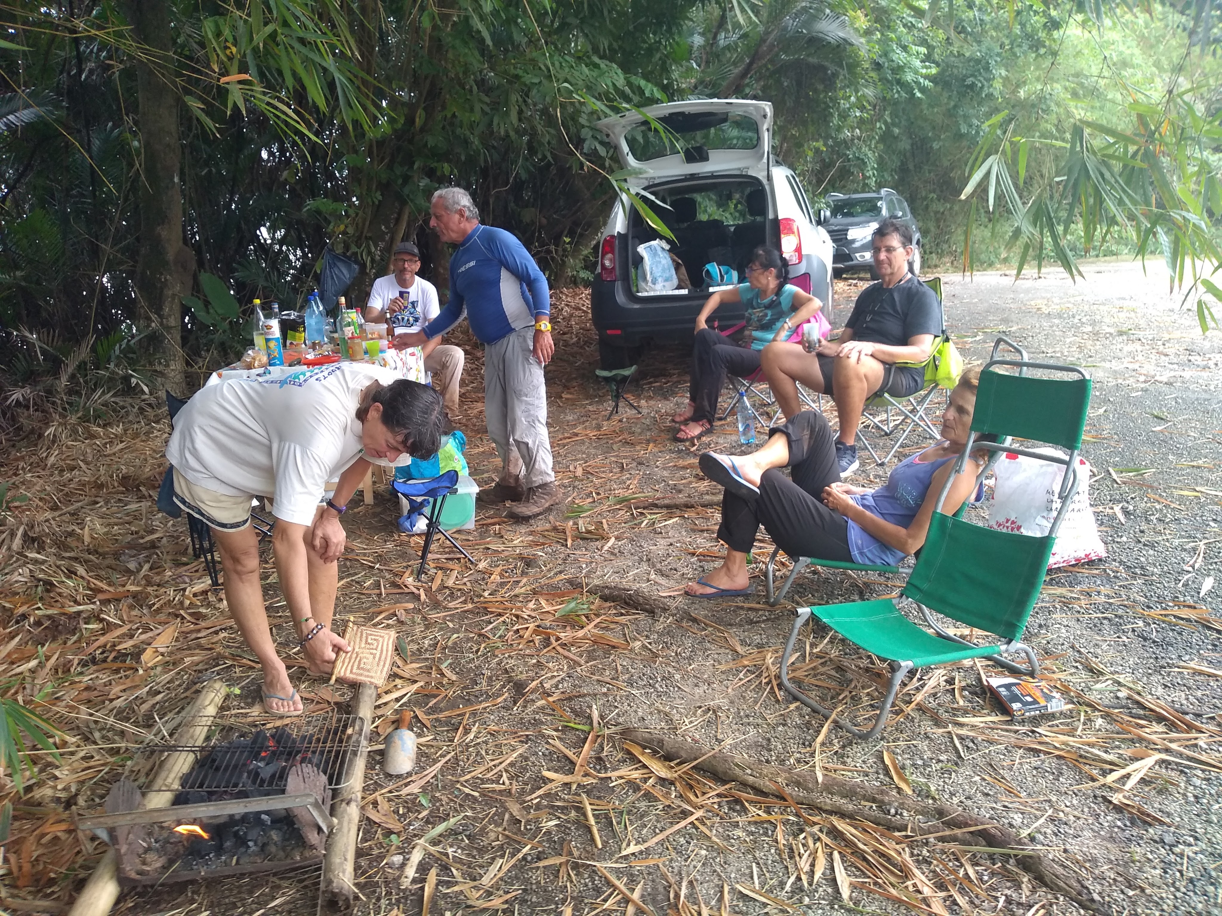 Après avoir sorti table, chaises, allumé le feu, nous goûtons aux rafraîchissements, apéritifs, grillades et mousse au chocolat bien mérités !