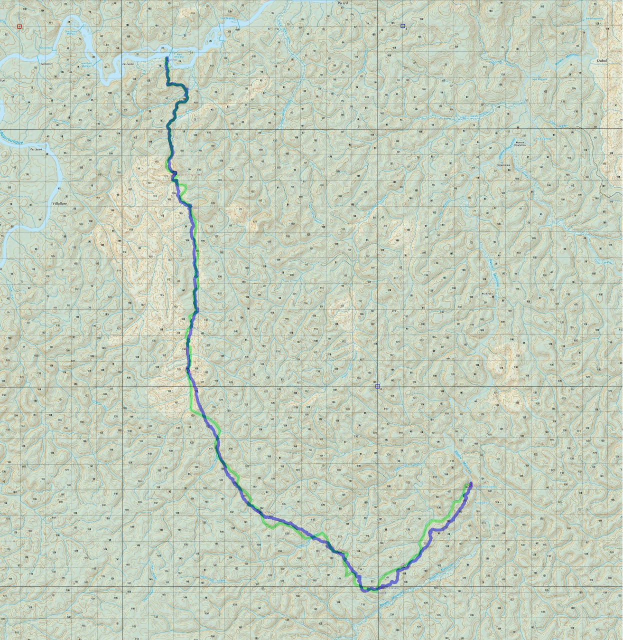 Le tronçon prévu le 1er jour entre saut Trou Cochon et Savane Roche Annabelle était trop ambitieux et nous avons pris du retard. Les points intermédiaires étaient espacés d’environ 6km efficaces. Les cartes IGN comme OSM s’avèrent fausses dans ce secteur : montagnes pas au bon endroit, et orientées différemment. Nous nous sommes rendu compte rapidement que nous ne pouvions pas leur faire confiance.
