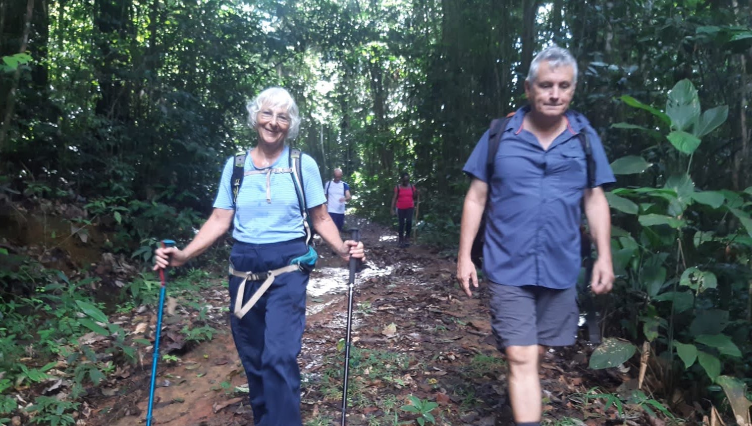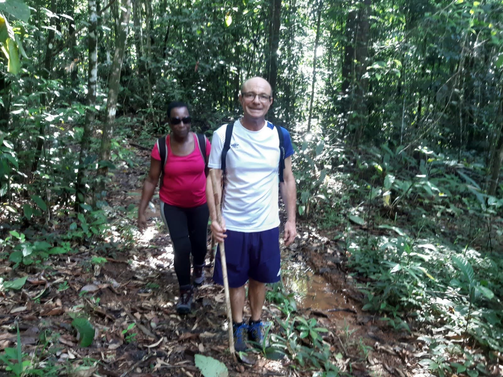 Dimanche, nous avons fait un aller-retour sur la piste Asarco depuis Amazone Lodge jusqu’au site de stockage des carottages, présentant un bon dénivelé. Départ à 8h, retour à 12h30. Pique nique au calme sur une table près de la maison de la réserve Trésor. Puis baignade rafraîchissante dans une « ambiance musicale » aux chutes Fourgassier. Visite de Roura : église, berges de l’Oyak.