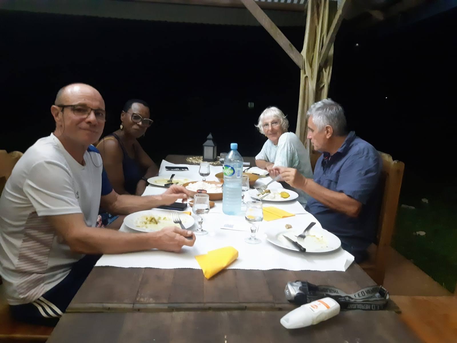 Puis installation au camp Caïman pour la nuit avec quelques innovations techniques. Nous avons dégusté un délicieux colombo de porc au restaurant du camp. Nuit de pleine lune magnifique.