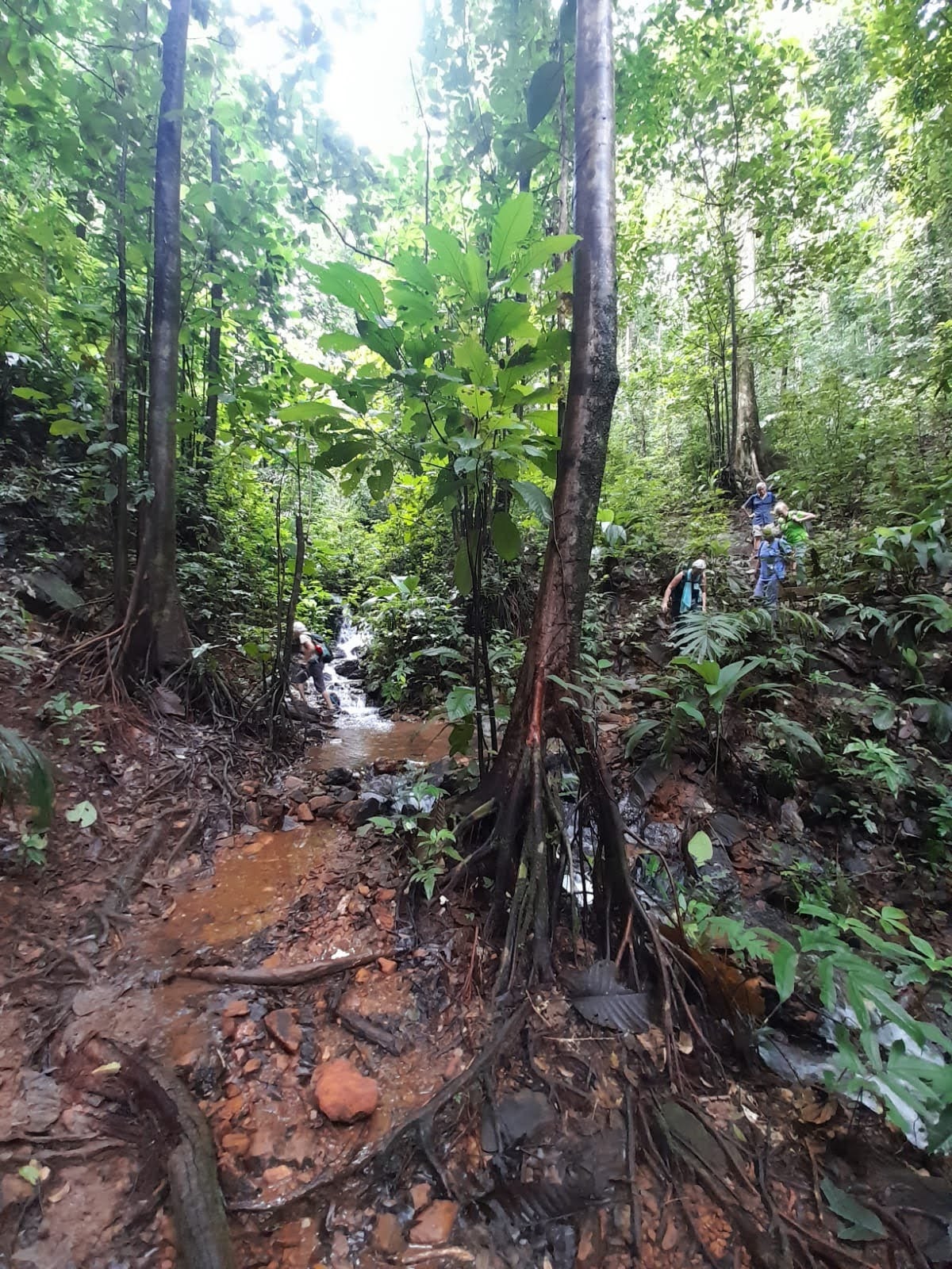 Lors de la descente vers la cascade, il y a beaucoup d’eau et nous devons traverser dans le courant pour rejoindre le tracé en face. Les pierres sont un peu glissantes mais tout le monde y arrive.