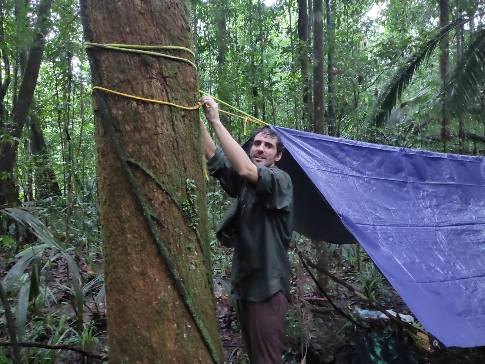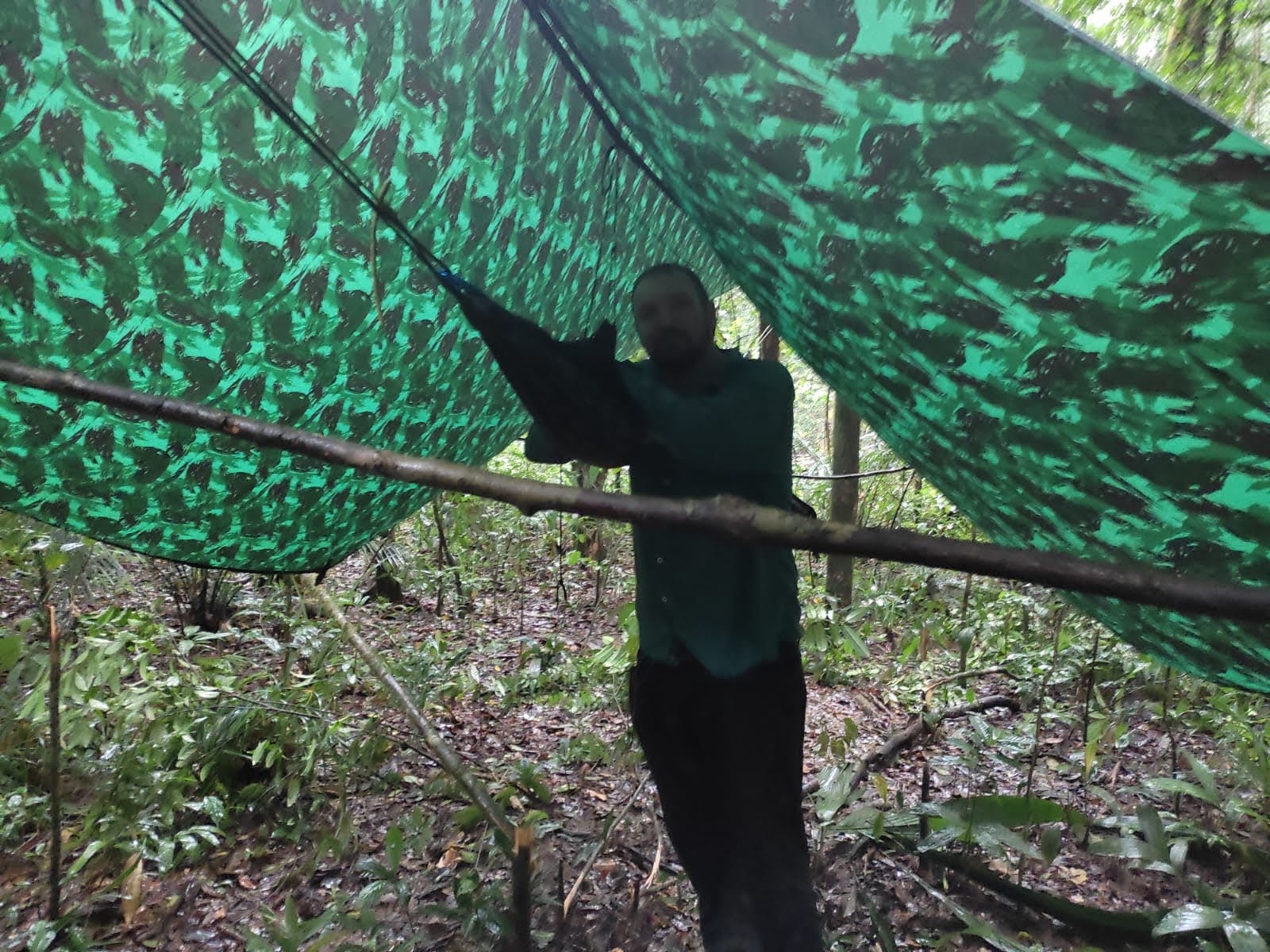 Le 1er jour nous nous sommes concentrés sur le montage du bivouac. Il n’y avait pas de vrai débutant et par conséquent nous en avons profité pour tester le matériel et les techniques : solidité et étanchéité des bâches, utilisation de piquets d’écartement des bâches par l’intérieur plutôt que des suspentes d’écartement par l’extérieur, tension du hamac, différents nœuds d’amarrage.