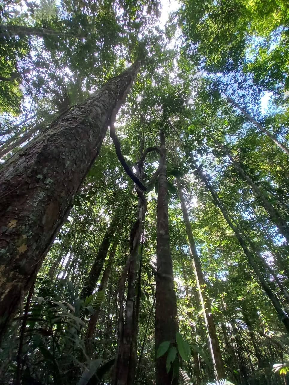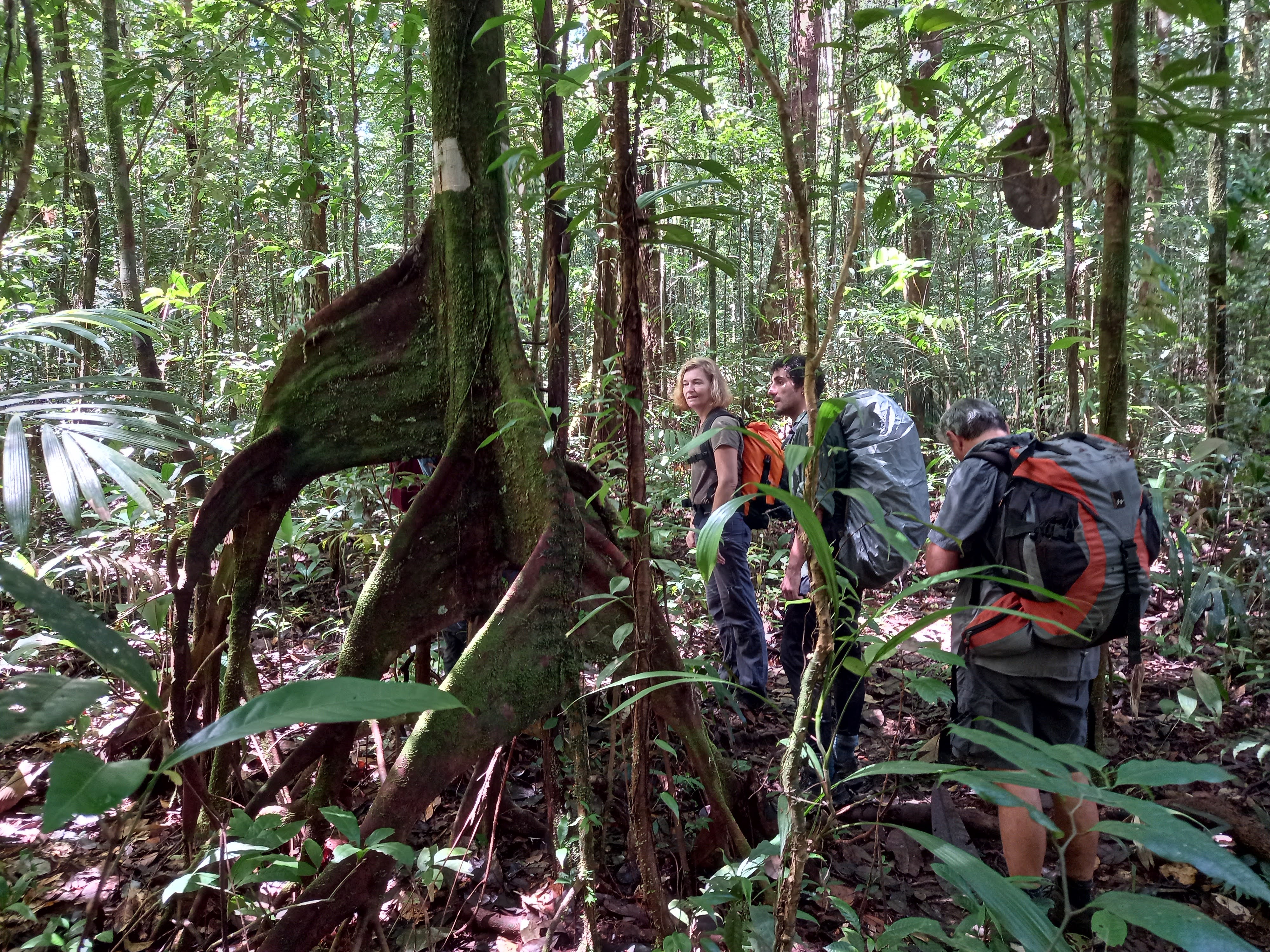 9h30 : C’est le départ sur l’Approuague. La journée est ensoleillée, le week-end pirogue + rando s’annonce bien. On s’engage sur la Mataroni, les racines de moutouchi sont dégagées, les hirondelles à ceinture blanche virevoltent au-dessus de la pirogue à moteur. Le piroguier nous dépose au niveau du sentier R de la Réginanaise.