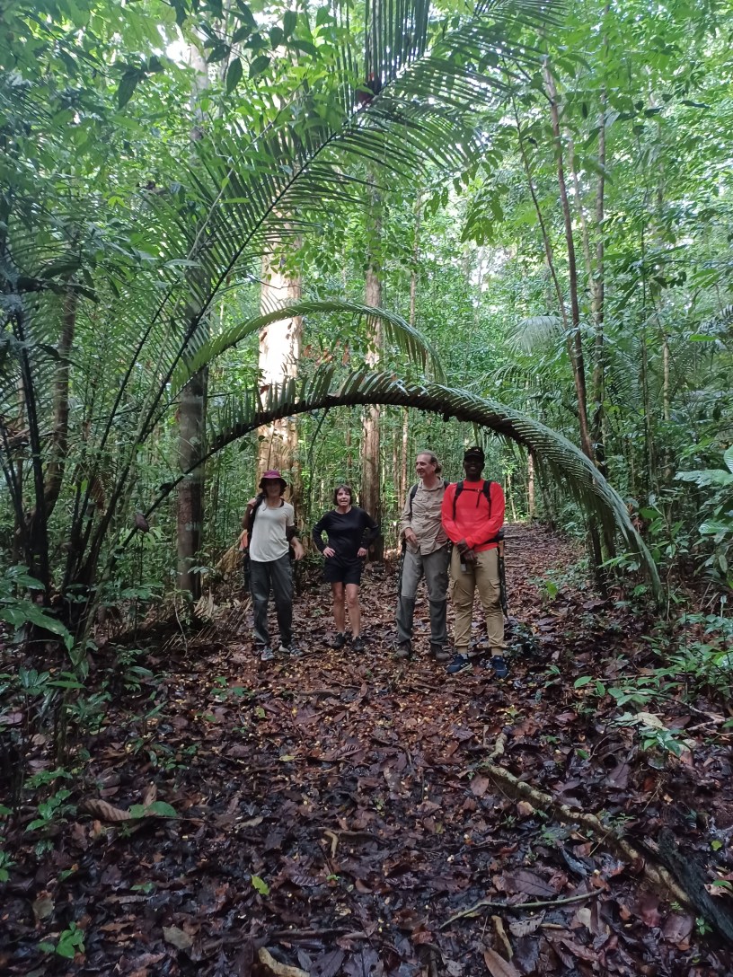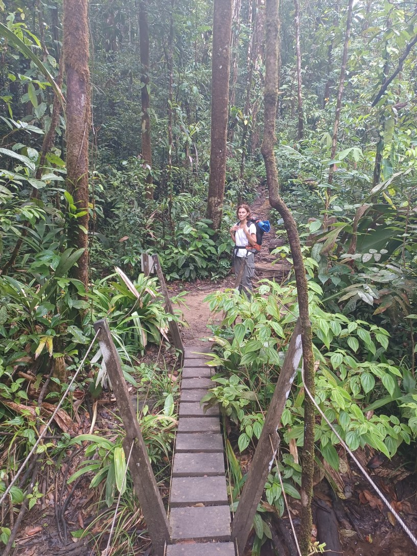 Pendant une petite demi-heure, nous longeons les rails qui nous conduisent jusqu’au carbet de Niak Rafting où nous sommes hébergés pour la nuit. Après avoir déposé nos affaires, nous entamons la première partie du sentier Anaoua : une courte boucle (1h30 au total) nommée sentier botanique très facile à parcourir.