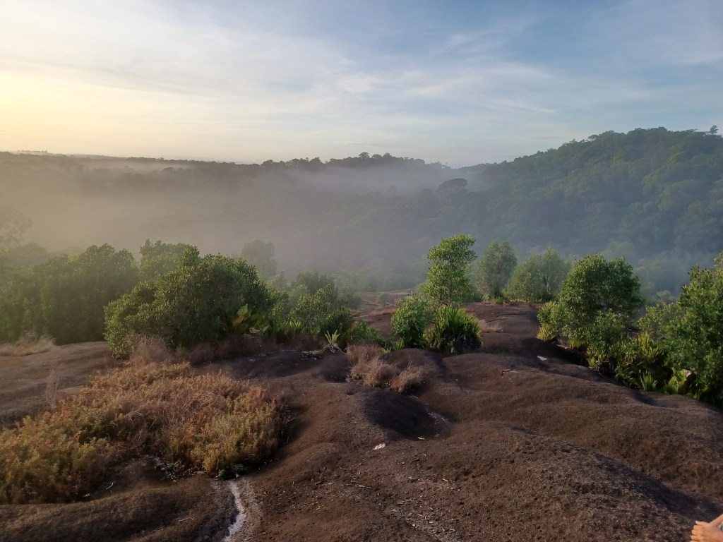 Le lendemain matin, nous nous réveillons tôt et constatons avec plaisir qu’il n’a pas du tout plu cette nuit : nous pouvons donc aller admirer le lever de soleil sur l’inselberg en toute sécurité (la mousse présente sur les roches les rend très glissantes par temps humide). Nous repartons vers 10h après avoir petit-déjeuné et défait notre campement. Au retour, étant moins pressés par le temps, nous pouvons prendre un peu de temps pour admirer la végétation.