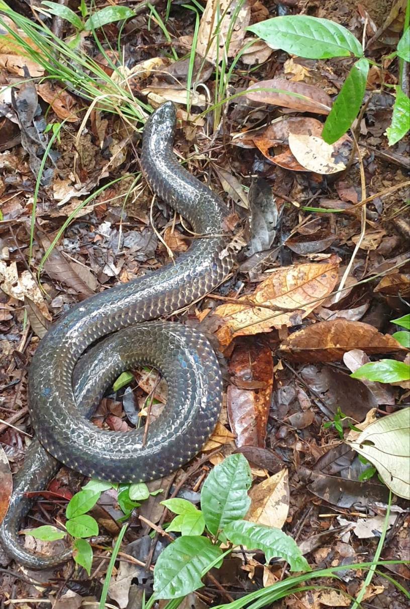 Un pseudoeryx écailleux, gros serpent gris, au bord des abattis, à l’arrivée de Favard.