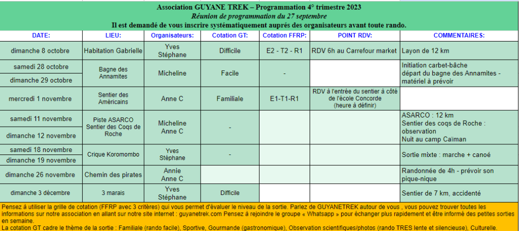 Si vous êtes déjà adhérents Guyanetrek, vous avez reçu ce programme par mail. Inscrivez-vous par mail auprès des organisateurs. Ceux-ci vous enverrons avant la randonnée, si cela est utile, des fiches explicatives avec des demandes d’informations (tarifs, intendance, acompte à verser…).