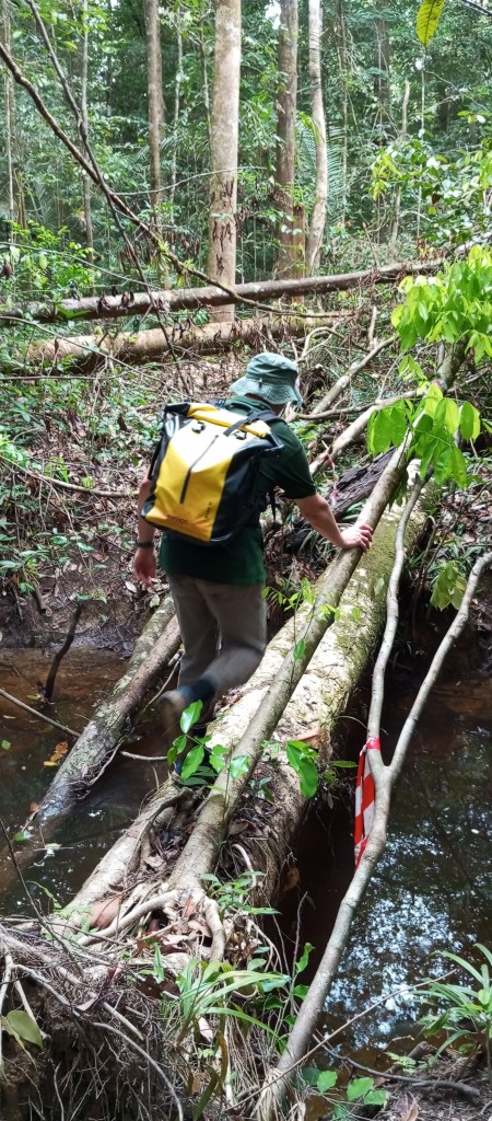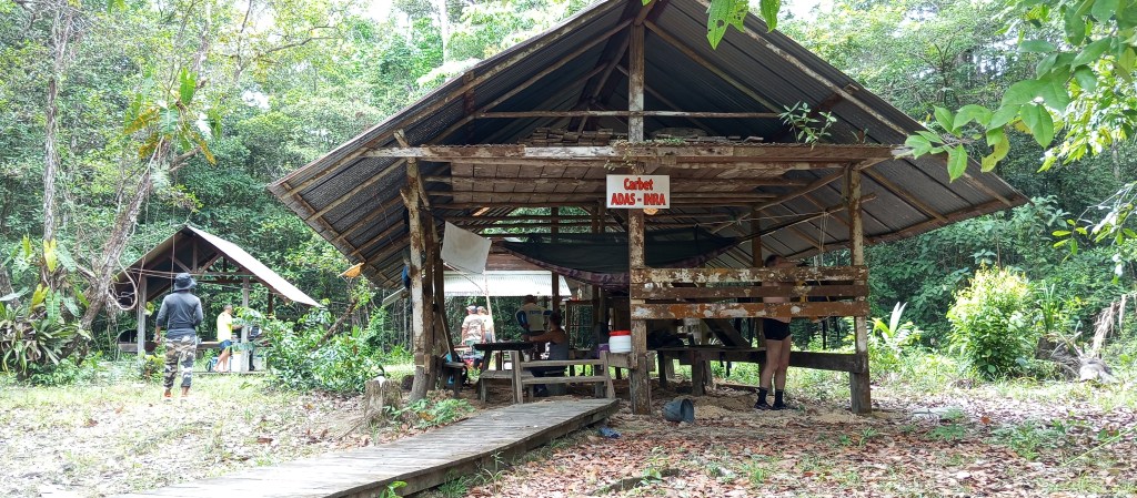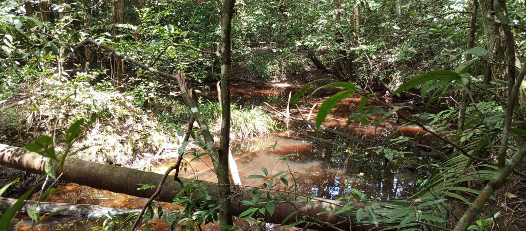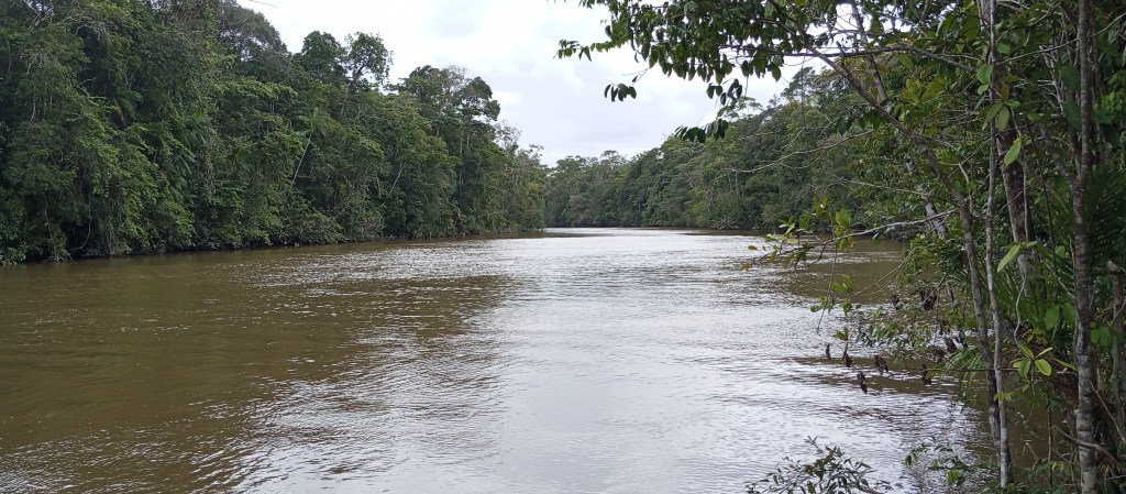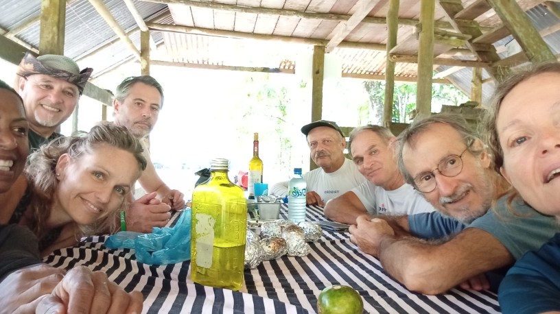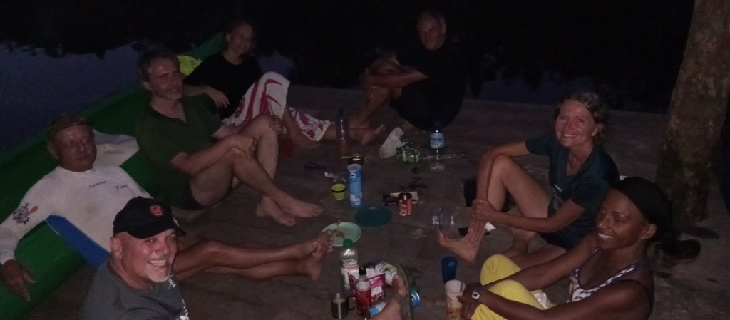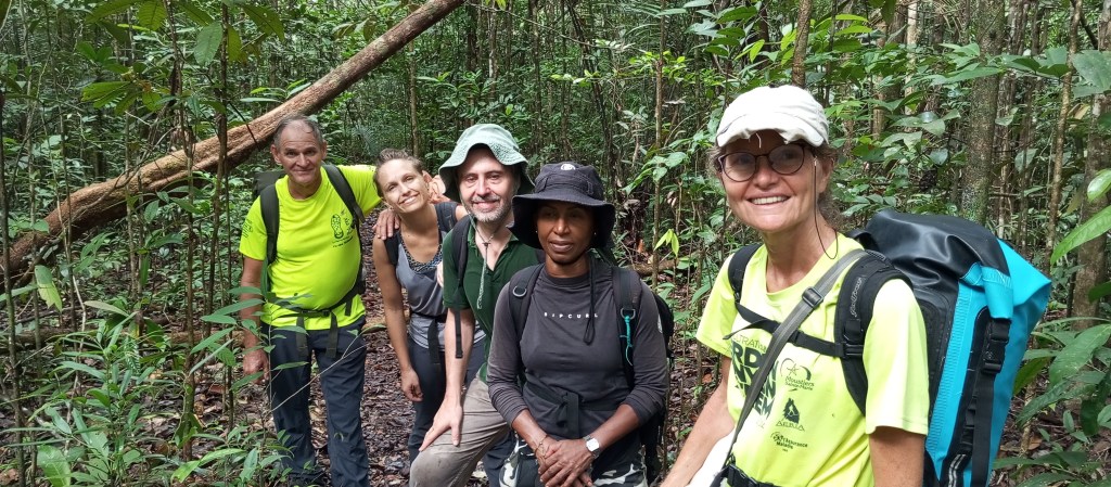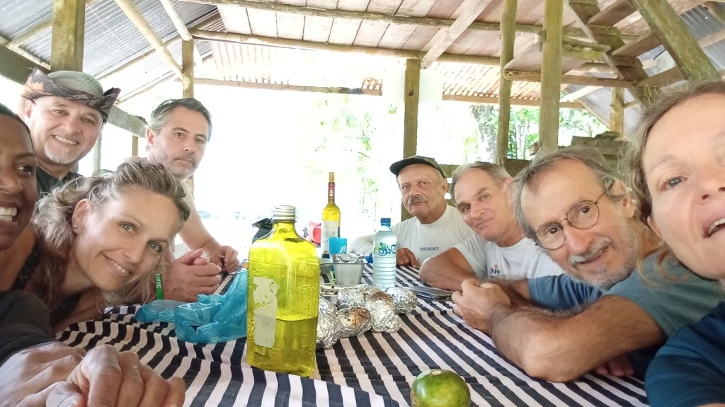 C’est de la montagne des singes que nous sommes partis pour ces 12 km de rando en direction du fleuve Kourou . Sac à dos moyennement chargé car Yves et Denis nous ont rejoints en canoë avec les affaires les plus lourdes ! Nous connaissons bien La piste Sourail et ce fut sans difficultés majeures que nous avons atteint le carbet de l’Inra ! Après quelques baignades, un apéritif a été improvisé sur le ponton en admirant le coucher de soleil. Nous avons dîner très copieusement, les sandwichs du midi étant déjà loin ! Dès le matin petit dej, baignades sympathiques et préparations du départ pour le retour ! Stéphane redescendant les 4 km du Kourou à la nage suivi du canoë.